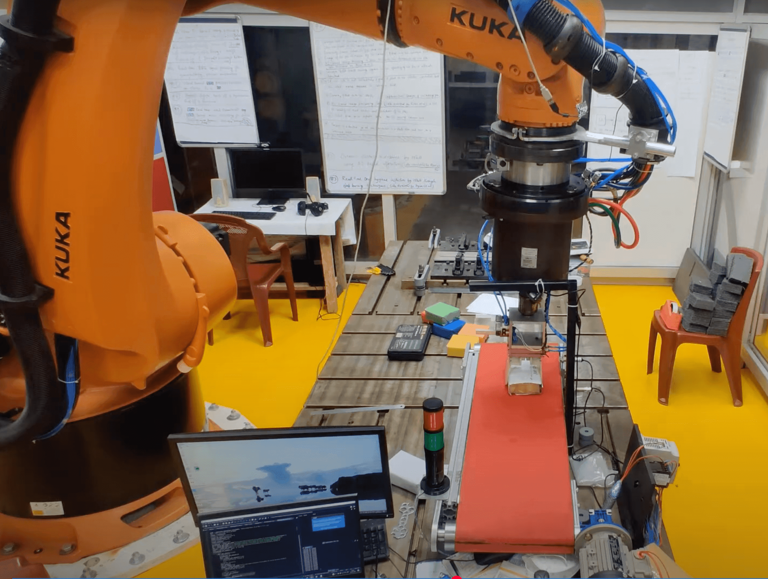 This project focused on automating object detection and grasping for a KUKA robot in an assembly line. The objective was to identify whether an object was cylindrical or cuboid to select the appropriate gripper type (three-fingered for cylindrical objects, parallel plate for cuboids). YOLOv4 was used to identify the cuboid and cylindrical objects.