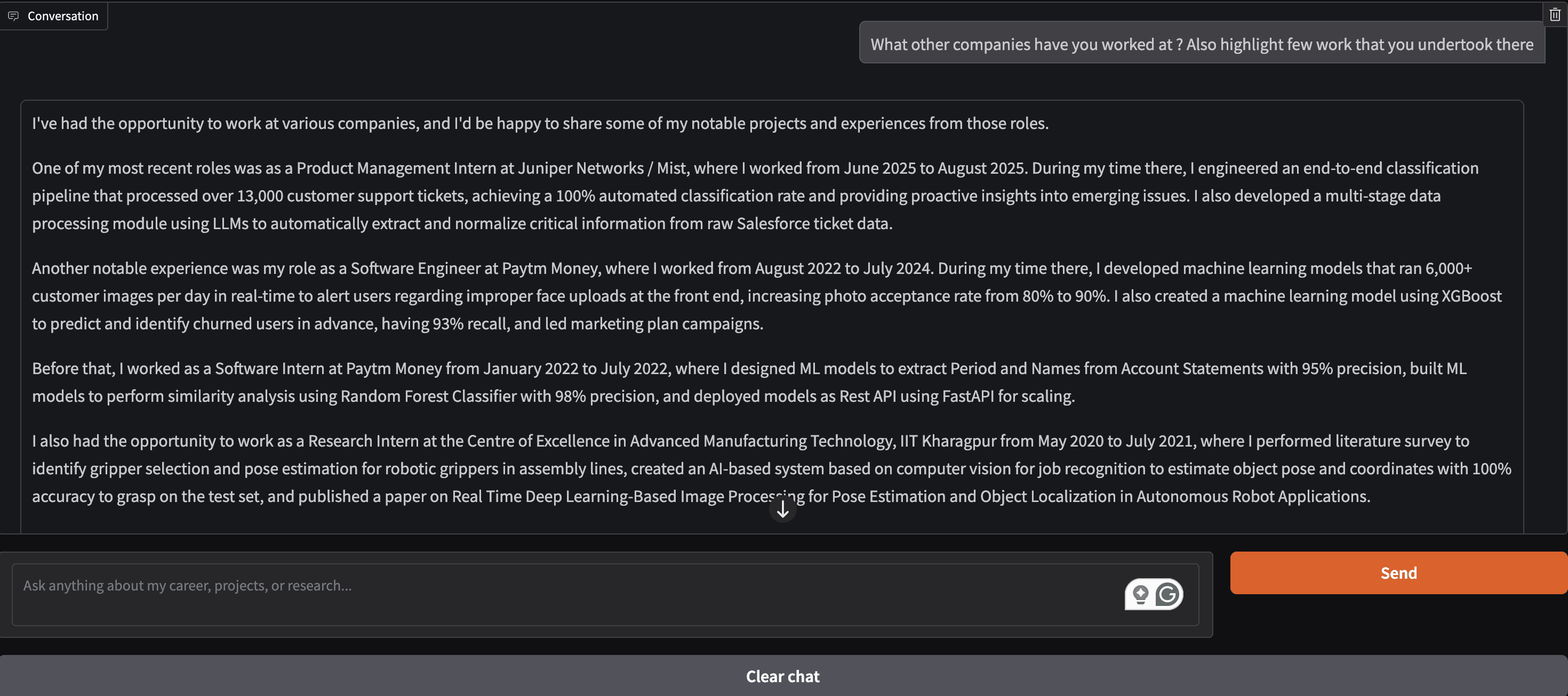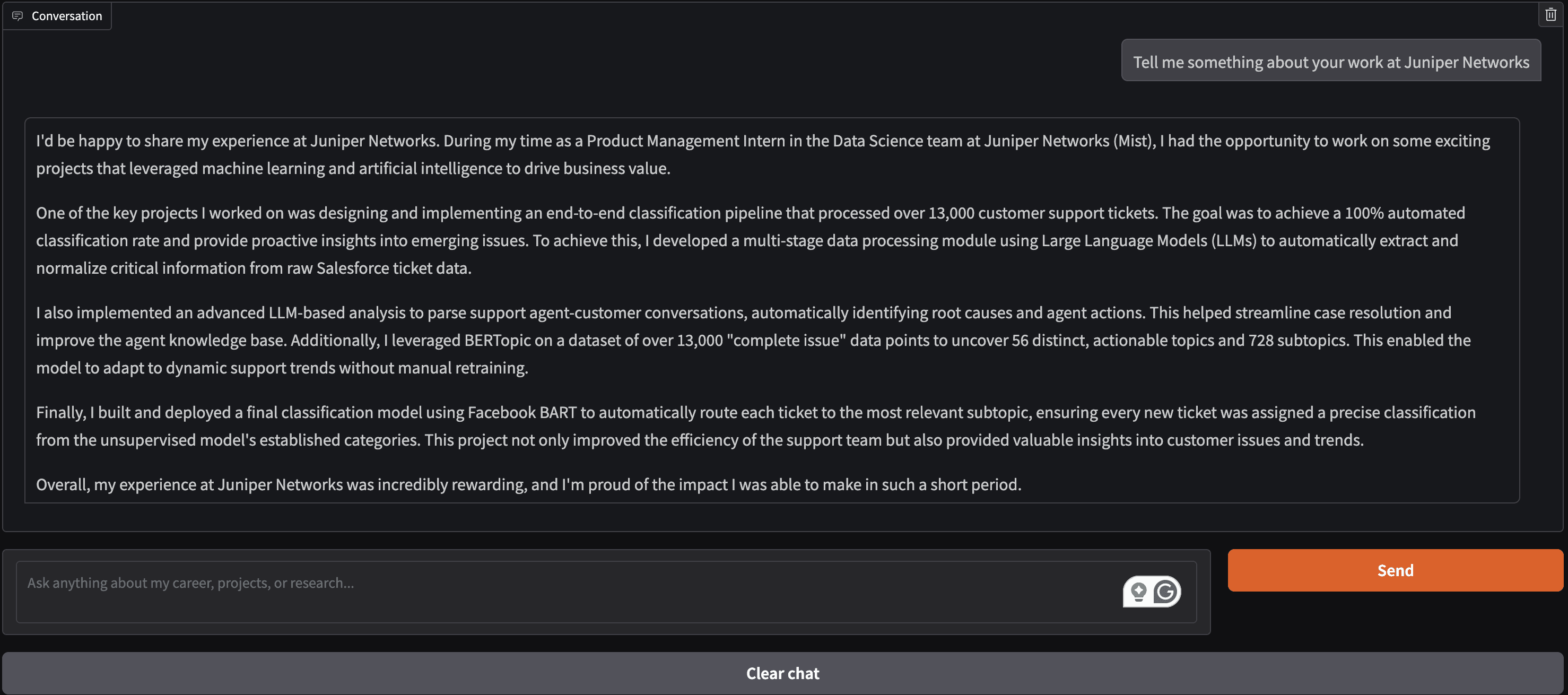 I’ve developed a "digital twin" RAG chatbot that answers portfolio queries using a FAISS index optimized for retrieving full content blocks rather than fragments. The pipeline ensures conversational continuity by rewriting multi-turn prompts into standalone questions and maintains high reliability through an LLM-as-judge evaluator that triggers bounded self-correction to prevent hallucinations. To stay current, the system automatically re-indexes my website daily, ensuring all responses are grounded in my latest professional data.